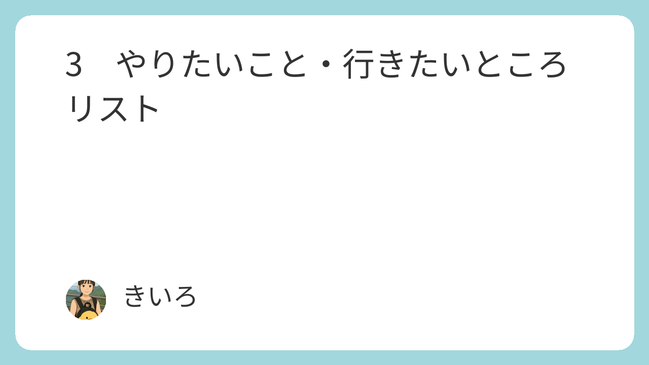 人生の目標を立てようと思った際にリサーチしたところ、「行きたいところや、やりたいことを100個あげてみたください。」とグーグル先生に言われ、書き出してみることにしました。